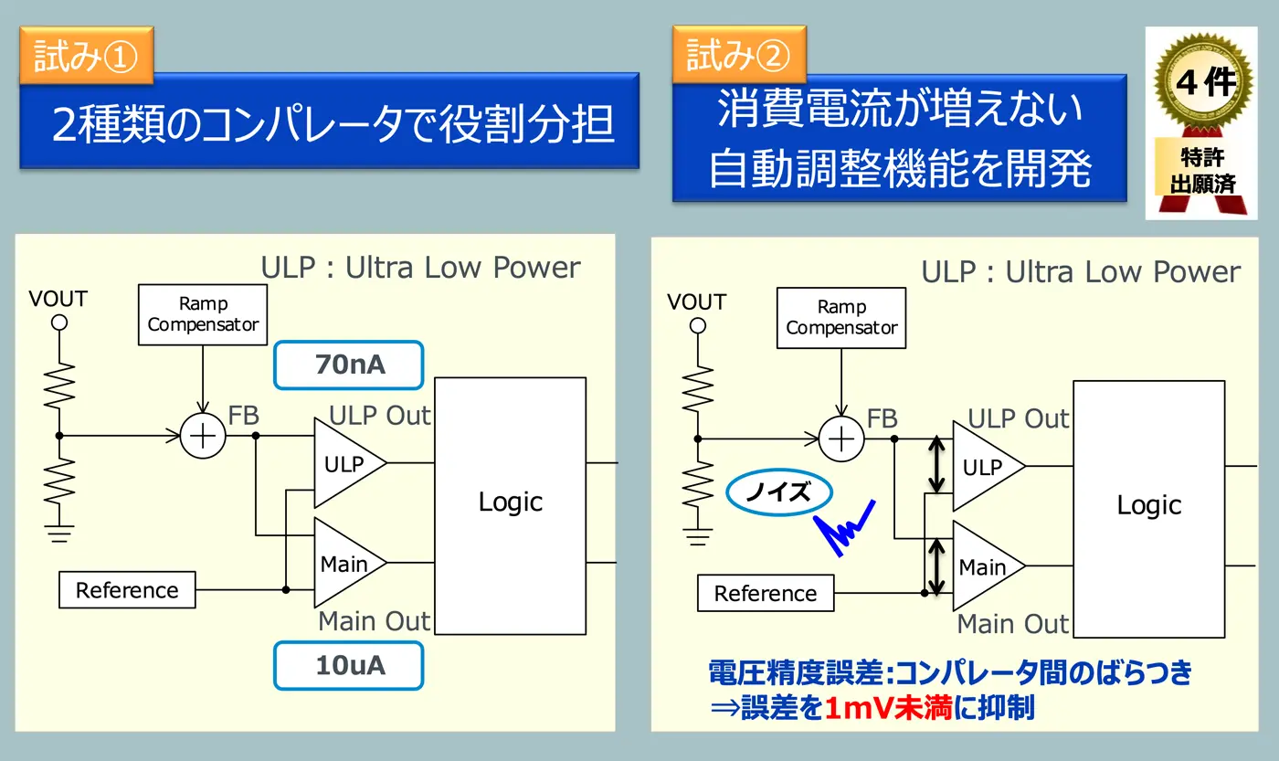 2つのコンパレータを用意して、一つは高速応答用、もう一つは低消費電力用、動作の要求に応じて切り替えながら制御するというところがポイントで、さらに2つのコンパレータ間で生じてしまう<ばらつき>を、自動補正するという技術も独自開発しました。」