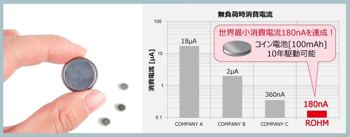 当時、競合の一社がすでにナノレベルのDC-DCコンバータを市場投入していましたが、ROHMが到達できていた最小値は約30μA。