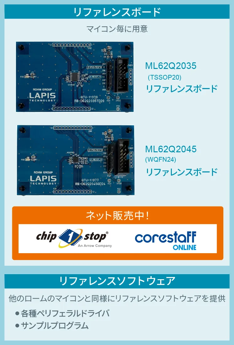 マイコンと必要最低限の部品を搭載したリファレンスボードです。目的に応じて必要な部品等を搭載して、マイコンの動作をお試しいただけます。