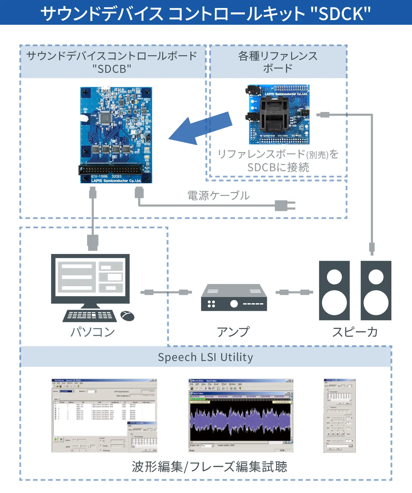 下記ハードウェアSDCBを介してリファレンスボード上の音声合成LSIにデータを書き込んだり、試聴するツールです。