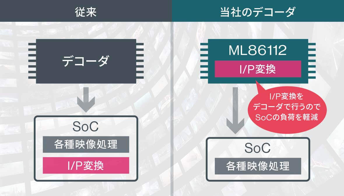 ML86112のI/P変換機能により、プログレッシブ方式のデジタル映像信号を出力し、SoC負荷を軽減します。