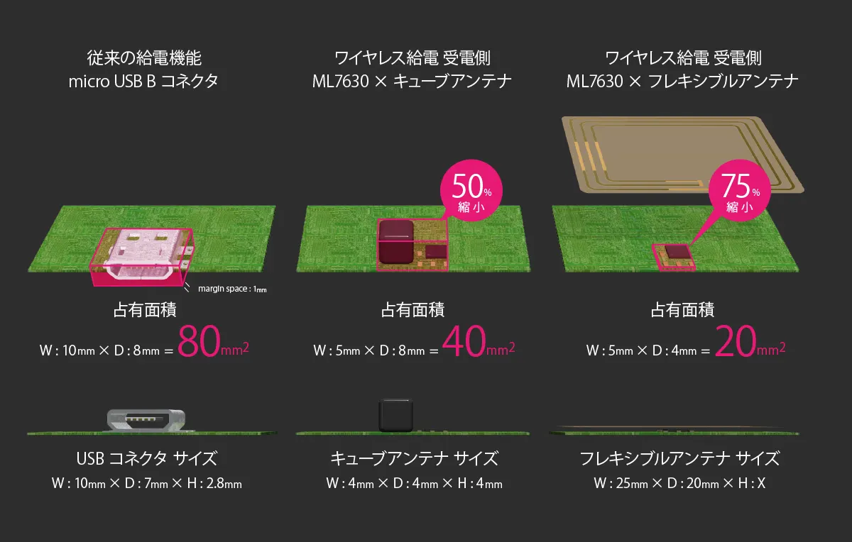 ウェアラブル等、小型デバイスなどの従来の給電方法であるUSBコネクター給電に比べ、LAPIS TECHNOLOGY™ の13.56MHz(NFC)ワイヤレス給電チップセット「ML7630 / 7631」を搭載したワイヤレス給電システムは、給電機能の省面積化が可能です。