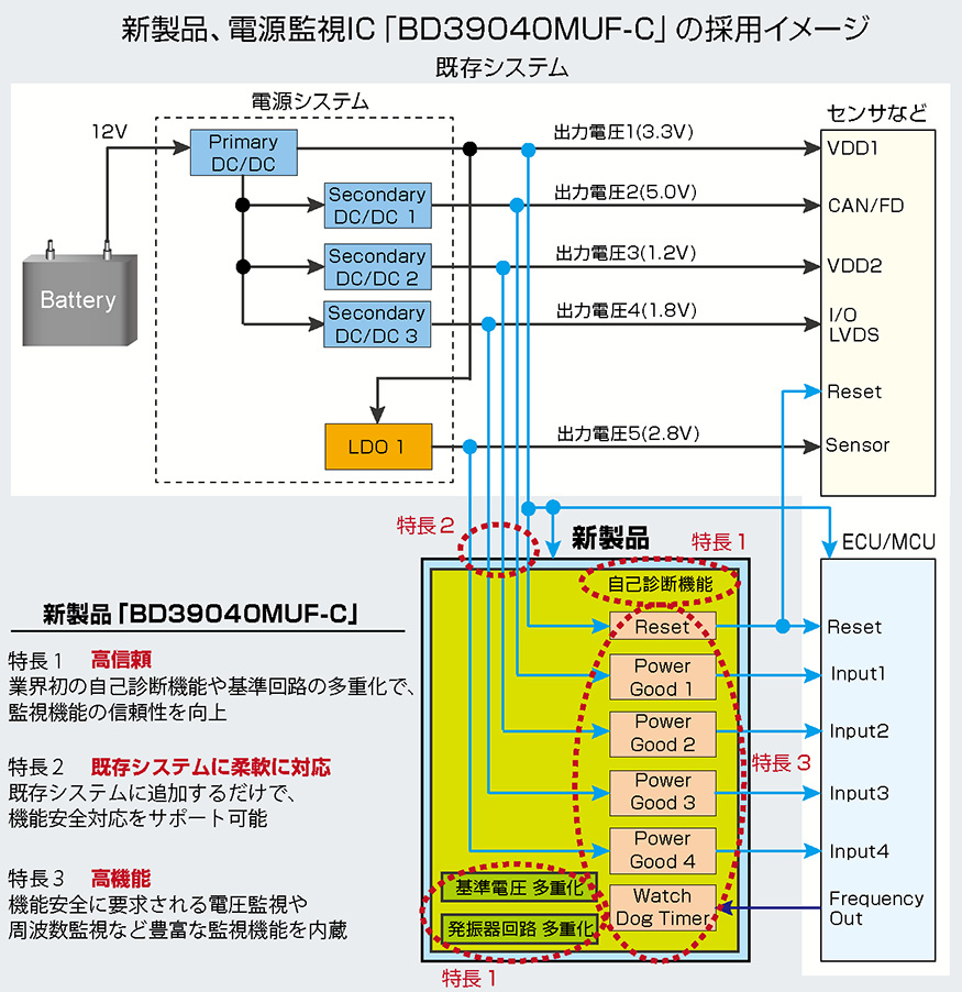 「BD39040MUF-C」は、業界で初めて自己診断機能を内蔵した電源監視ICとして、下記特長によりADAS、自動運転に必要な機能安全対応システムの構築に貢献します。