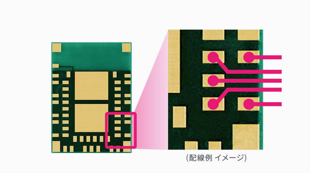 一般的に、32本相当の無線通信モジュールを小型化する場合、パッド (電極) をしきつめて配置しなければならず、内側の信号線を引き出すために、特殊な加工や多層基板を必要としていました。本製品は、独自のパッド配置を採用することにより、小型でありながら、32本の全入出力信号線を引き出すことができるため、安価な2層基板に実装することが可能です。