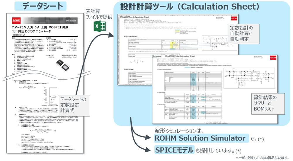 データシートに記載された周辺回路設計の理論式をエクセルベースで自動計算し、設計範囲を外れていないか自動判別、BOMリスト化まで可能です。本シートで設計した定数を無償のWebシミュレーションツール(ROHM Solution Simulator)に反映させる事で、動作波形の検証まで実施できます。シミュレーションツール保有のユーザー向けには、SPICEモデルを提供しています。
