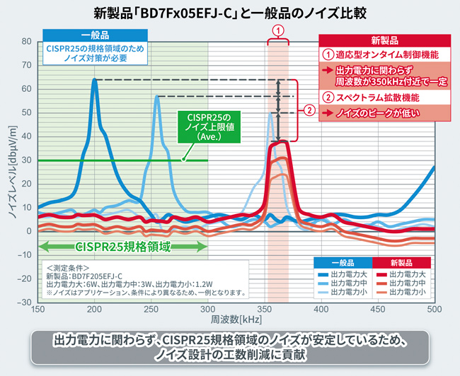 新製品は、ロームが得意とするアナログ設計技術を駆使することで、従来2次側の電圧・電流を検知するために必要とされたフォトカプラ※3もしくはトランスの補助巻き線及び周辺部品などを不要としました。フォトカプラの課題である消費電力の大きさや温度による検知精度の変化、経年劣化等を改善するとともに、部品点数削減による小型化も実現しています。このため、一般的なフライバック方式の絶縁電源回路と比較した場合、フォトカプラ及び電流検出用途の周辺部品等で10個、基板面積にして約30%削減可能です。また、新製品はスイッチングのオン時間を固定する適応型オンタイム制御機能の搭載により、出力電力に関わらずスイッチング周波数が350kHz付近で安定しています。車載EMC規格のCISPR25※4に対応する場合、150kHz~300kHzの周波数帯は特にノイズ対策が必要ですが、新製品はこの周波数帯に入らないため、アプリケーションでのノイズ対策が容易です。これにより、放射ノイズの低減に寄与するスペクトラム拡散機能※5と合わせて、ノイズ設計の工数削減に貢献します。