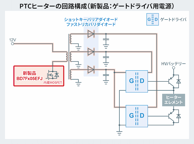 ローム株式会社(本社:京都市)は、xEV(電動車)の主機インバータやオンボードチャージャー(以下、OBC)、電動コンプレッサー、PTCヒーター※1などに搭載されているゲートドライバ駆動用電源に最適な、絶縁型フライバック方式※2のDC-DCコンバータ「BD7F105EFJ-C」及び「BD7F205EFJ-C」を開発しました。