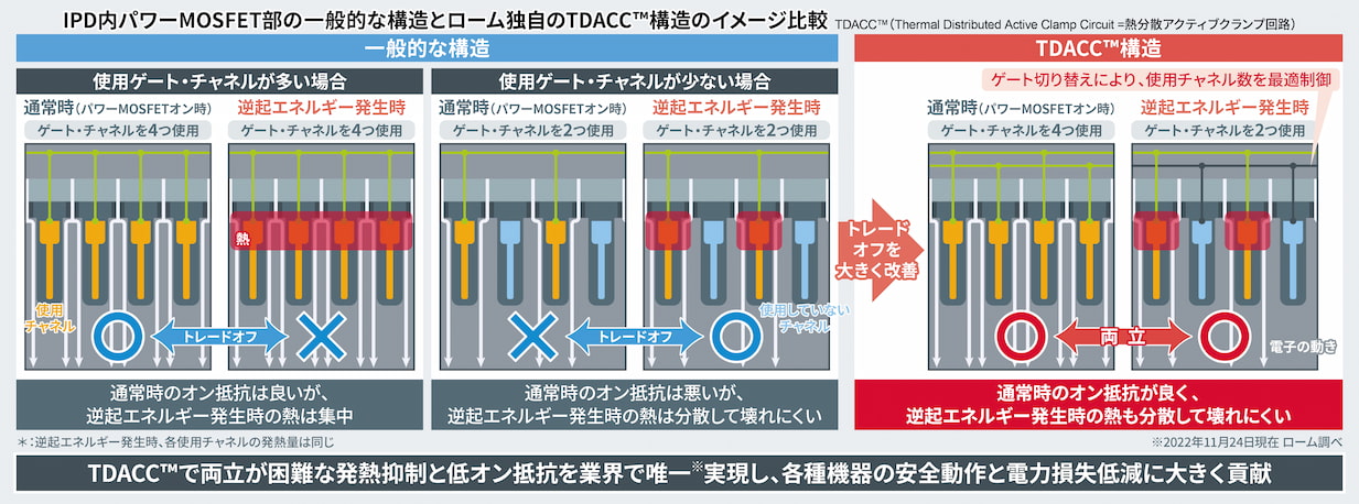 - IPD内のパワーMOSFET部がオフ時の逆起エネルギーによって発熱する際、電流を流すチャネル数を最適に制御することにより、小型サイズを維持したままでは両立が困難な発熱抑制と低オン抵抗を実現した、ローム独自の回路・デバイス技術。