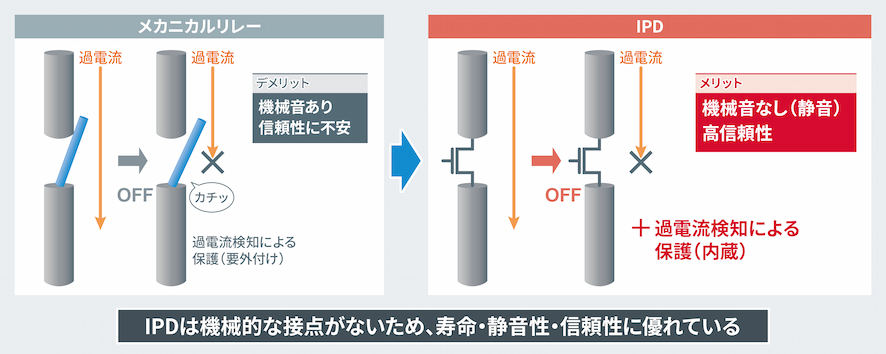 - 電子回路のオン/オフ制御に加え、回路を電気的破壊(異常時の過電流)から保護できるデバイス。従来から採用されているメカニカルリレーと異なり機械的な接点がないため、寿命、信頼性、静音性に優れる。また、一般的な半導体スイッチ素子であるMOSFETは過電流によって破壊に至る可能性があるが、IPDは保護機能を搭載しており、安全で信頼性の高いシステム構築が可能となる。