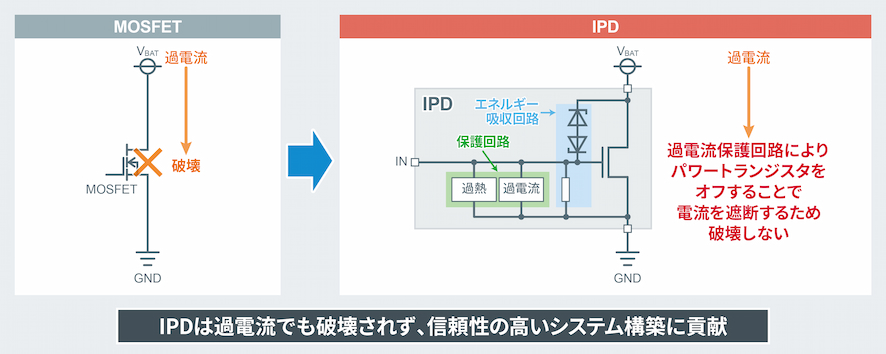 IPDは、電子回路のオン/オフ制御に加え、回路を電気的破壊(異常時の過電流)から保護できる機能を搭載しており、安全で信頼性の高いシステム構築に貢献します。