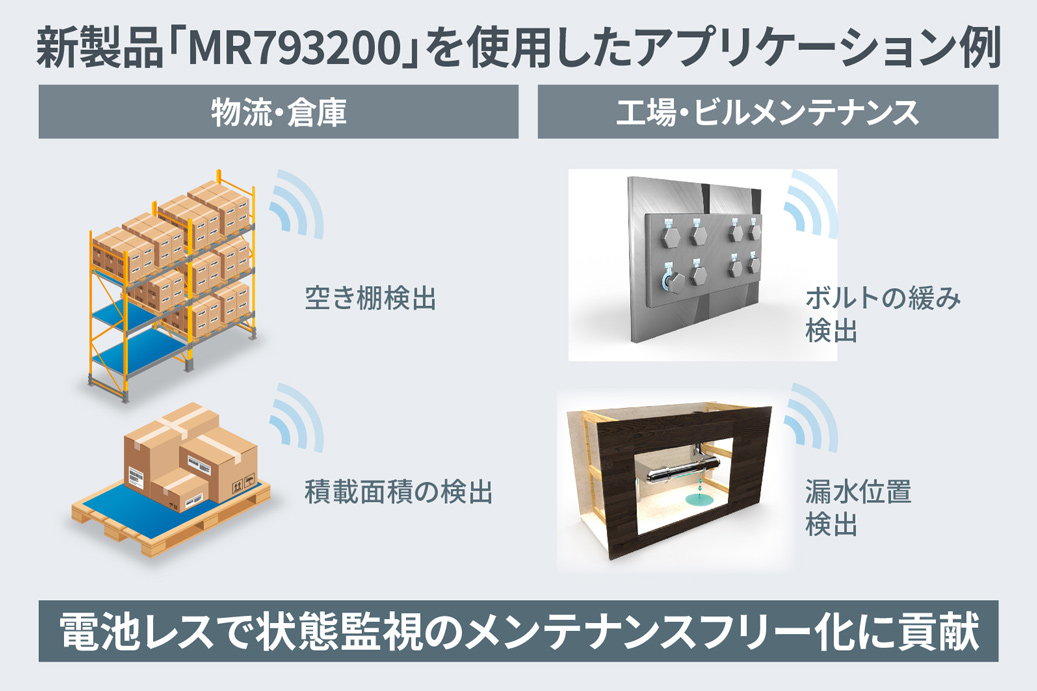新製品は、通常のRFID通信だけでなく、内蔵する静電容量センサも電池不要で動作できます。3m程度のRFID通信と静電容量による状態検出をワンチップかつ電池不要で実現でき、重量変化や構造劣化などの状態監視を行うIoT機器のメンテナンスフリー化に貢献します。