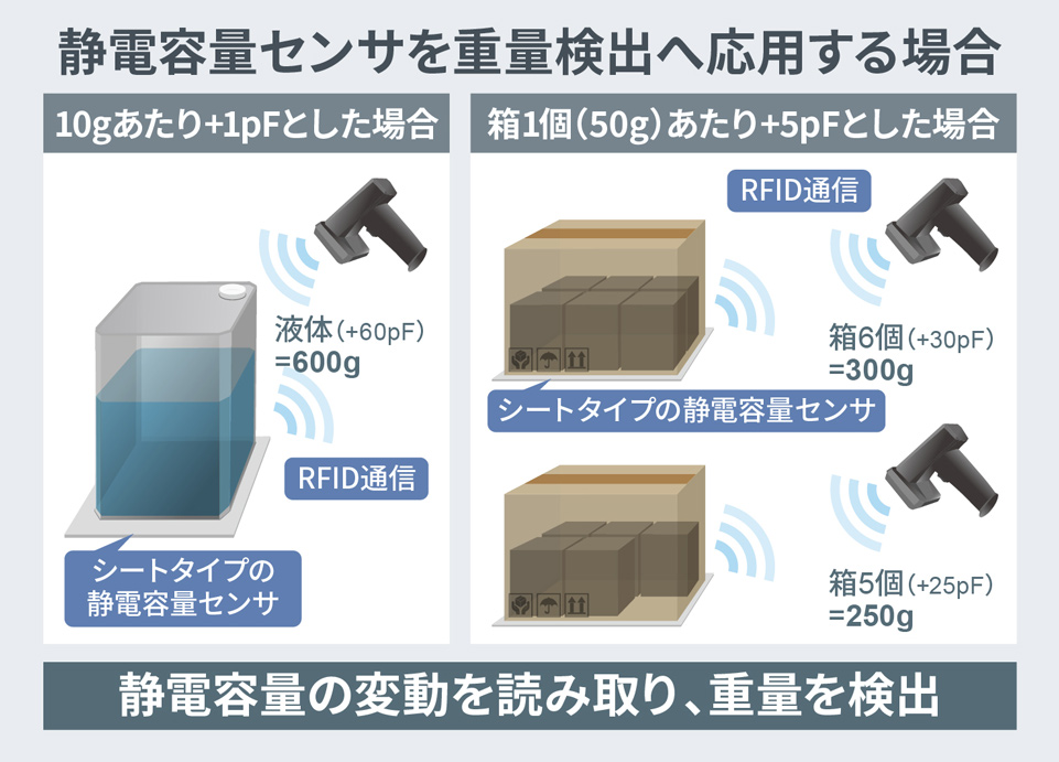 新製品に内蔵された静電容量センサは、電池不要でありながら最大100pFの静電容量まで対応でき、±5%の高精度で測定できるため、高静電容量と検出精度が必要なアプリケーションに適用可能です。例えば、物流パレットでの細かな重量検出、数10cmのケーブルでのゆがみ検出など適用範囲が広いため、さまざまなセンサ電極形状・材質を活用した電池不要なIoT機器の開発にも貢献できます。