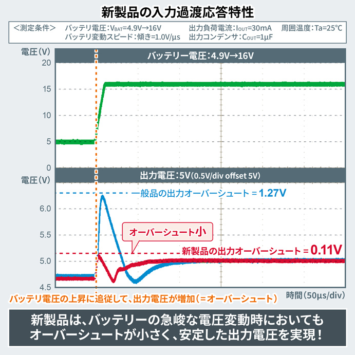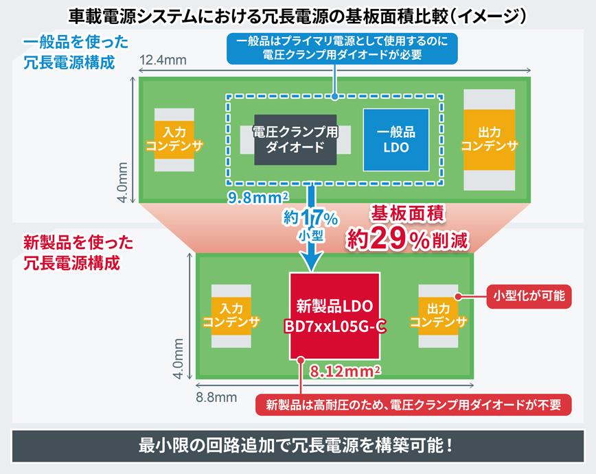 ローム株式会社(本社:京都市)は、車載電源システムの信頼性向上を目的として車載アプリケーションでも搭載が進む冗長電源※1に最適な、定格電圧45V耐圧、50mA出力対応のプライマリ※2LDOレギュレータ※3(以下、LDO)「BD7xxL05G-Cシリーズ」(BD725L05G-C、BD730L05G-C、BD733L05G-C、BD750L05G-C)を開発しました。新製品は、小型サイズ(2.9mm x 2.8mm)でありながら高耐圧(Max.=45V)と低消費電流(Typ.=6μA)を実現しており、常時駆動が求められる冗長電源を構築する際の主要な要求に適合します。また、ロームが得意とするアナログ制御技術により、バッテリーの急峻な電圧変動時においても安定した出力電圧を実現。同一条件で比較した場合、一般品では最大1.2Vを超えるオーバーシュートが発生するため、サブマイコン等の後段デバイスにおける定格電圧を超えないように大容量の出力コンデンサなどが必要となりますが、新製品はオーバーシュートが0.1V程度のため出力コンデンサの小型化が可能です。これにより、一般品を使用した冗長電源回路と比較して約29%基板面積を削減できることから、最小限の回路追加で冗長電源を構築可能です。さらに、新製品は外乱ノイズにも高い耐性を持ち、ISO 11452-2のアンテナ照射試験においても試験範囲の全周波数において出力電圧に変動がほぼ発生しないため、ノイズ対策の工数も削減します。