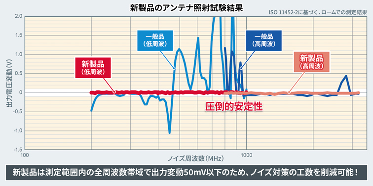 さらに、新製品は外乱ノイズにも高い耐性を持ち、ISO 11452-2のアンテナ照射試験(耐ノイズ性能の国際標準規格)において、測定範囲内の全周波数帯域で、出力電圧の変動量を50mV以下(±1%以下)に抑制できるため、ノイズ対策の工数も削減します。
