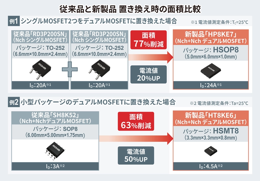 新製品は、ロームの最新プロセスおよび裏面放熱パッケージを採用することで、業界トップの低オン抵抗(Ron)*3を達成しました(Nch+Nchの場合、HSOP8で19.6mΩ、HSMT8で57.0mΩ)。一般のデュアルMOSFETと比べてオン抵抗を最大56%低減しており、機器の低消費電力化に大きく貢献します。また、2つのチップを1パッケージに同梱したことで面積を削減でき、機器の省スペース化に寄与します。例えばHSOP8の場合、1チップ内蔵のシングルMOSFET(TO-252)2つから置き換えることが可能なため、面積を77%削減できます。