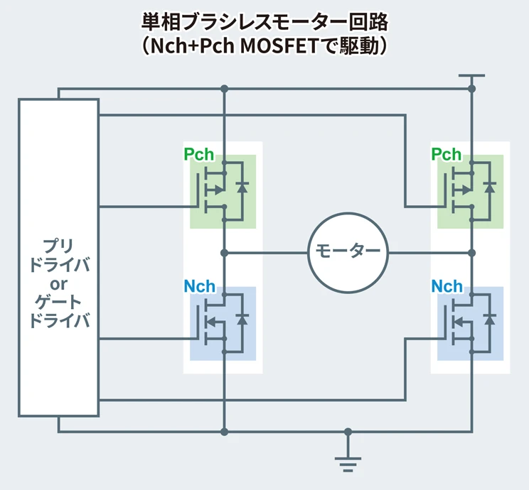 本製品は、豊富な採用実績を誇るロームの単相/三相ブラシレスモーター向けプリドライバICとの組み合わせにより、さらなるモーター基板の小型化、低消費電力、静音ドライブの検討が可能となります。デュアルMOSFETシリーズとプリドライバICを組み合わせた周辺回路設計のトータルサポートを行い、お客さまのニーズに応じた最適なモーター駆動ソリューションを提供します。