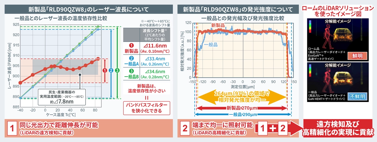 「RLD90QZW8」は、3D ToFシステム*2を用いて距離測定や空間認識を行うLiDAR向けに開発された、赤外120W高出力レーザーダイオードです。独自の素子開発技術により、レーザー波長の温度依存性を一般品比66%減となる⊿11.6nm(平均0.10nm/℃)まで低減させています。これにより、バンドパスフィルター*3の狭小化に寄与するため、LiDARの遠方検知に貢献します。また、業界最小クラス※の発光幅270µmでありながら、発光幅の97%にあたる264µmの領域で均一な発光強度を実現しており、LiDARの高精細化にも貢献します。さらに、新製品は高い電力光変換効率(PCE)も実現しており、高効率な光出力が可能となることから、LiDARの低消費電力化にも貢献します。
