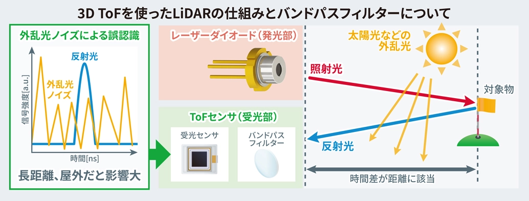 - 特定の光の波長帯の信号だけを通過させるフィルターのこと。オプティカルデバイスにおいては、バンドパスフィルターの範囲が狭ければ、ピーク波長に近い光のみを効率的に取り出すことができるため、太陽光などの外乱光ノイズの影響を極小化でき、同じ距離であれば低消費電力化が、同じ光出力であれば距離の伸長が可能となる。