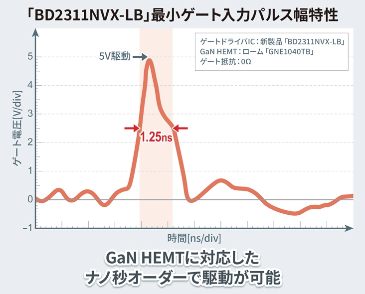 新製品は、ナノ秒(ns)オーダーのゲート駆動スピードを実現し、GaNデバイスを高速にスイッチングさせることが可能です。この特性は、GaNデバイスを熟知し、ゲートドライバICの性能を追求できたからこそ実現できた特性であり、最小ゲート入力パルス幅1.25ナノ秒での高速スイッチングにより、アプリケーションの小型化、省エネ化、高性能化に貢献します。