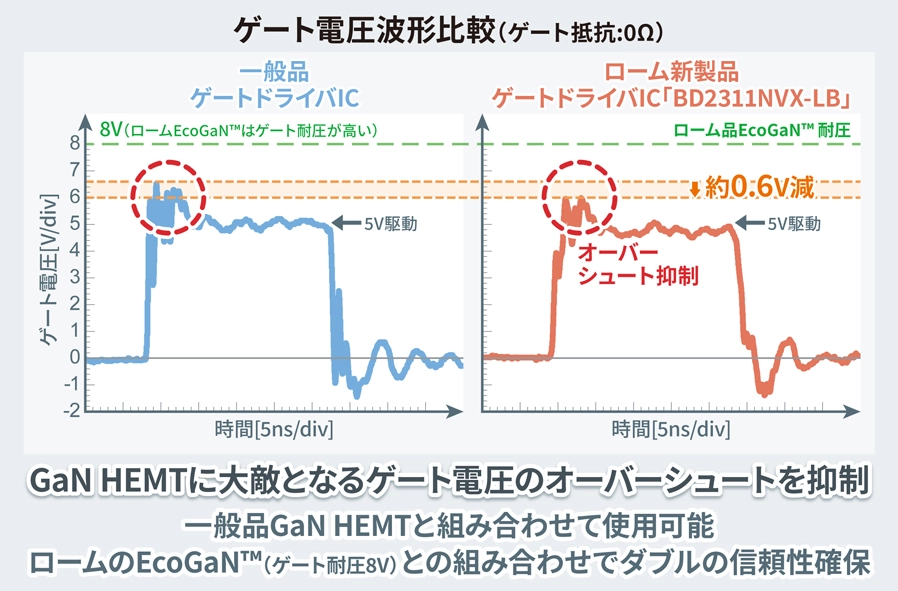 また、独自の駆動方式を採用することで、これまで非常に難しいとされていたゲート入力波形のオーバーシュート*1を抑制する機能も搭載しており、過電圧入力によるGaNデバイスの故障を防ぎ、ロームのEcoGaN™と組み合わせて構成することで、セット設計の容易化を実現するとともに、アプリケーションの信頼性向上にも寄与します。さらに、アプリケーションによるさまざまな要求に対しても、ゲート抵抗を調整することで、最適なGaNデバイスを選定することが可能です。