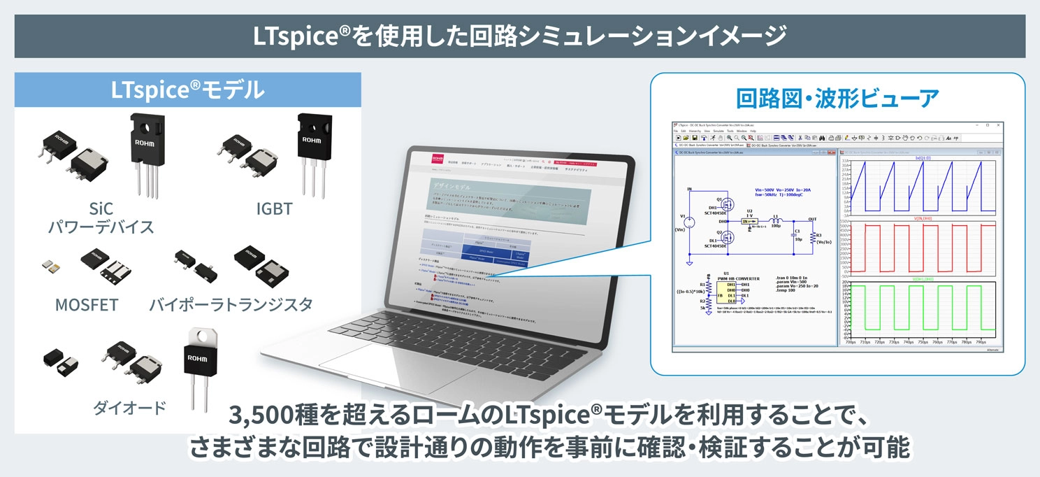 ローム株式会社(本社:京都市)は、回路シミュレータ*1であるLTspice®向けSPICEモデル*2のラインアップを拡充しました。LTspice®は回路図キャプチャや波形ビューア機能も備えており、設計通りの動作が実現できているか事前に確認・検証することができます。ロームはこれまでバイポーラトランジスタ、ダイオード、MOSFET*3のLTspice®モデル提供を行ってきましたが、今回新たにSiCパワーデバイス、IGBT*4などを追加したことで、3,500種を超えるディスクリート製品のLTspice®モデルを各製品ページからダウンロードできるようになりました。これにより、ローム公式Webの掲載製品に対するLTspice®モデルの掲載カバー率は80%を超え、パワーデバイスなどのディスクリート製品を組み込んだ回路シミュレータによる設計の利便性向上に貢献します。