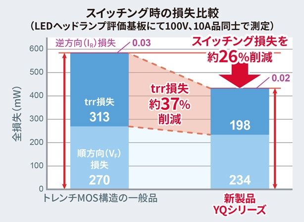一方、一般的なトレンチMOS構造では、寄生容量(デバイス中の抵抗成分)が大きくなるため、プレーナ構造に比べてtrrが悪化します。「YQシリーズ」は、VFとIRの改善に加えて、独自の構造設計により、trrも業界最高クラスの約15nsを達成。スイッチング時の損失を約26%低減可能なため、アプリケーションの低消費電力化に貢献します。