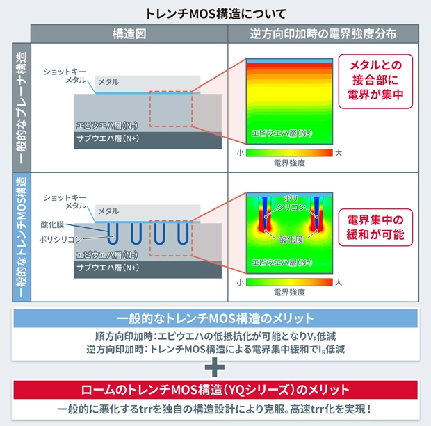 トレンチMOS構造は、エピウエハ層にポリシリコンで溝(トレンチMOS)を形成した構造であり、電界集中を緩和することが可能です。これにより、エピウエハ層の低抵抗化が可能となることから、順方向印加時においては低VF化を実現します。また、逆方向印加時においては、電界集中を緩和できるため、低IR化を実現します。前述した「YQシリーズ」は、このトレンチMOS構造の採用により、従来品比でVFを約7%、IRを約82%改善しています。