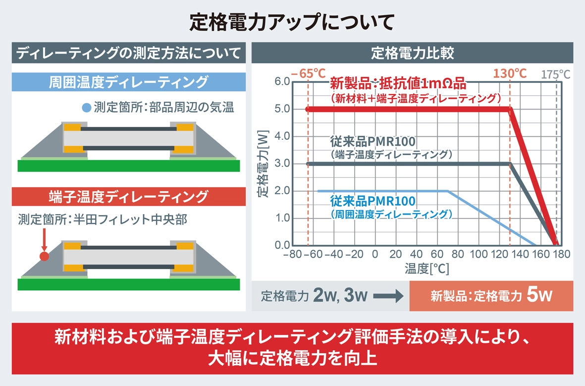 新製品は、温度特性に優れた新材料および端子温度ディレーティング*1の導入により、定格電力5Wを達成。これは、6432サイズの保護膜ありフラットチップタイプでは業界最高クラスです。従来品であるPMR100の2W品と比べ定格電力を約2.5倍、3W品と比べ約1.7倍向上することで高電力大型タイプからの置き換えが実現できるため、アプリケーションの小型化に貢献します。また定格端子温度*2130℃(0.5mΩ・1mΩ品の場合)および使用温度範囲-65℃~+175℃を保証しており、高温環境下でも安定した動作を確保できます。さらに、優れた抵抗温度係数(TCR*3)±75ppm/℃により、高精度かつ信頼性の高い電流検出が可能です。