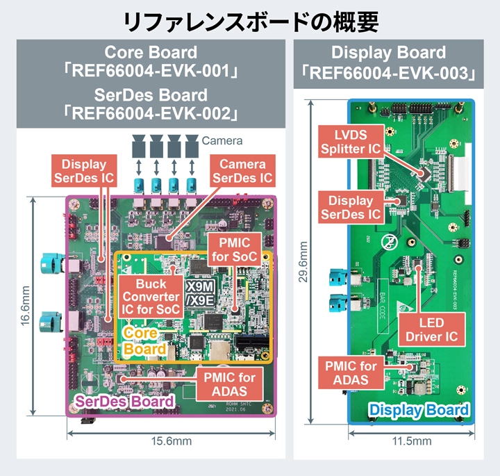 ローム株式会社(本社:京都市)は、スマートコックピット向けSoC*1メーカーの中国最大手、Nanjing SemiDrive Technology Ltd.(以下、SemiDrive)とスマートコックピット向けリファレンスデザイン「REF66004」を共同開発しました。このリファレンスデザインは、SemiDriveの車載SoC「X9M」及び「X9E」を中心に構成されており、ロームのPMIC*2やSerDes IC*3、LEDドライバIC等が搭載されています。また、リファレンスデザインをベースとしたリファレンスボード「REF66004-EVK-00x」も用意しており、Core Board、SerDes Board、Display Boardの3枚で構成されています。リファレンスボードについては、担当営業もしくは、ロームWebのお問い合わせ先よりお問い合わせください。