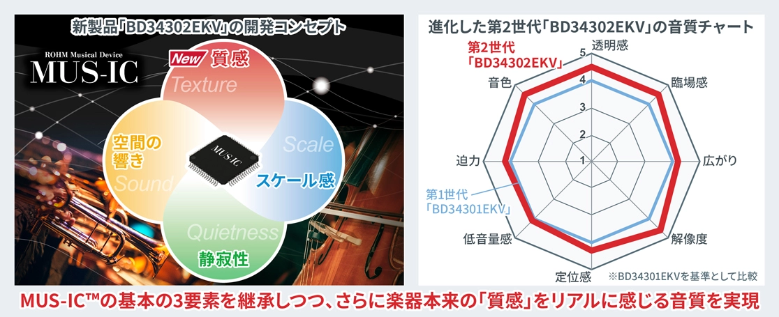 MUS-IC™シリーズの第1世代オーディオDACチップ「BD34301EKV」は音質を高く評価され各社のフラッグシップモデルに採用されており、「BD34302EKV」はその第2世代品です。ロームDACチップの基本コンセプトである「自然でフラットな音」を継承しつつ、MUS-IC™シリーズの「空間の響き」「静寂性」「スケール感」の3要素に加え、新製品は楽器の音の「質感」をリアルに表現することを目指しました。