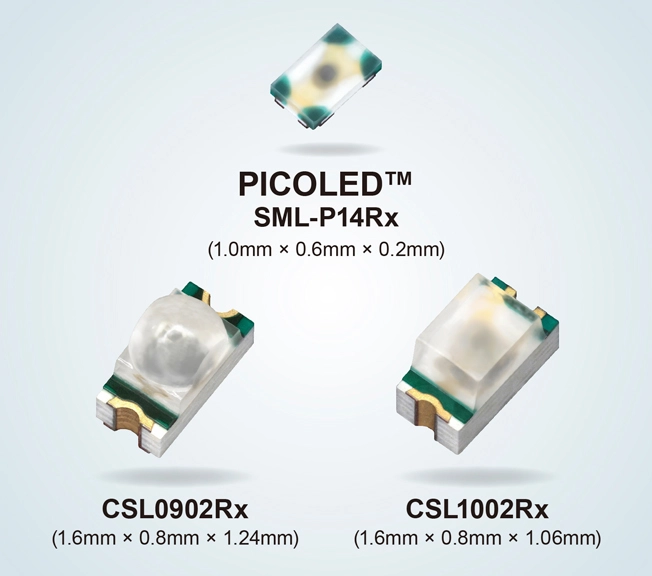 - ロームが、素子製造工程からの開発により超小型・超薄型を実現した、小型モバイル機器やウェアラブル機器への採用に最適なチップLEDシリーズ。
