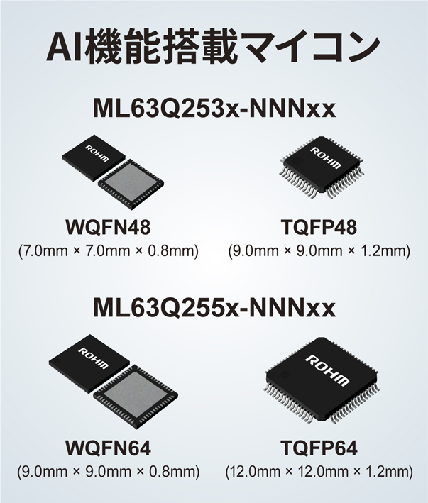 ローム株式会社(本社:京都市)は、モーターなどの産業機器をはじめ、あらゆる機器でセンシングデータを活用した故障予兆検知や劣化予測を可能にするAI(人工知能)機能搭載マイコン「ML63Q253x-NNNxx / ML63Q255x-NNNxx」(以降、AIマイコン)を開発しました。本製品は、ネットワーク不要で学習と推論を単体で実現する、業界初のマイコンです。