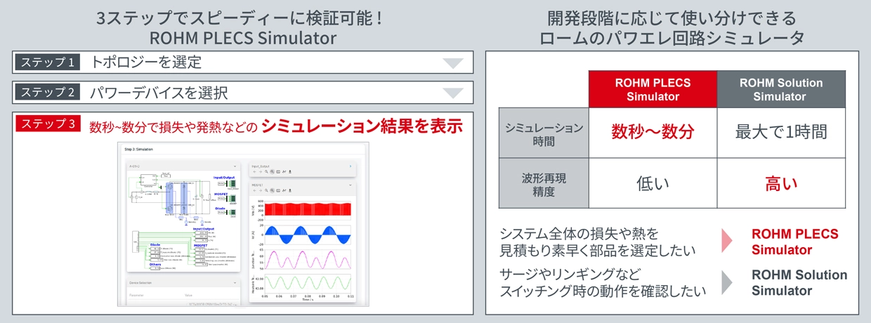 この要望に対してロームは、損失と熱計算に特化した「ROHM PLECS Simulator」の提供を開始しました。PLECS®を用いたスピーディーな初期検討と、「ROHM Solution Simulator」が得意とする詳細かつ高精度な検証を開発フェーズに応じて使い分けることで、設計の損失・熱検証から波形チェックまで一貫したシミュレーションが可能になります。