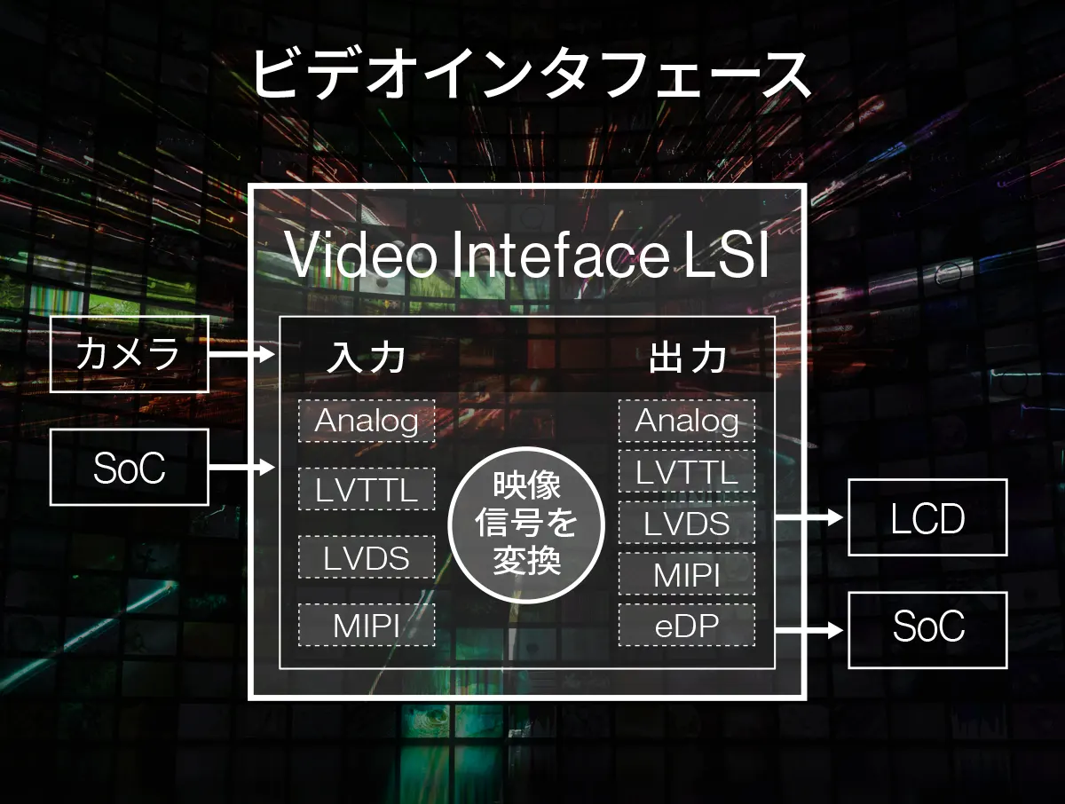 ビデオインタフェースは、Analog / LVDS / MIPI等の様々なフォーマットの映像信号をSoC (System-on-a-chip)の入出力フォーマットに合わせて変換します。
