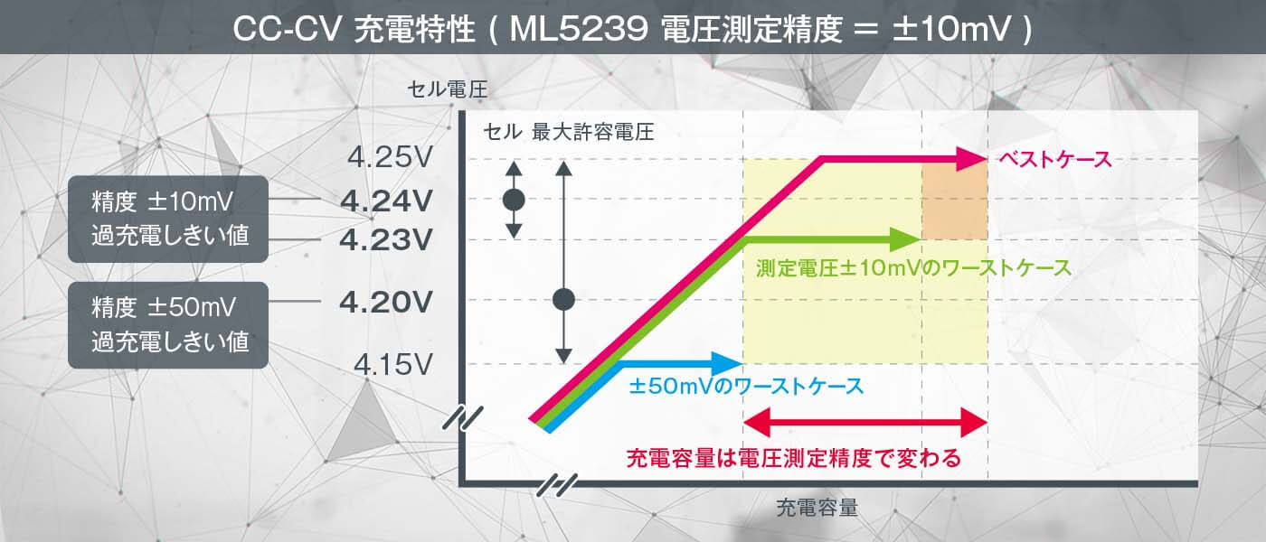 ML5248、ML5236、ML5238のセル電圧測定精度は各々±20mV、±15mV、±20mVです。