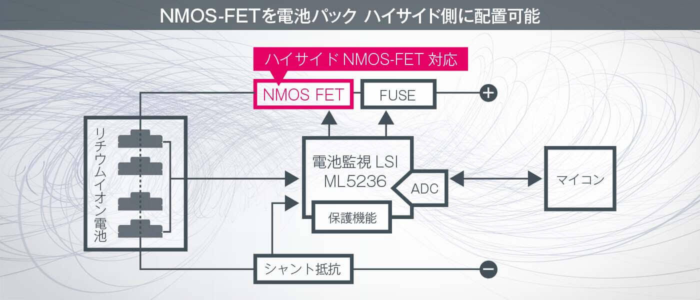 ML5248とML5236では充放電制御用スイッチとしてNMOS-FETを電池パックの高電圧側 (ハイサイド) に配置することができるため、コスト上昇することなくマイコンを含めた全体の設計を容易にすることが出来ます。