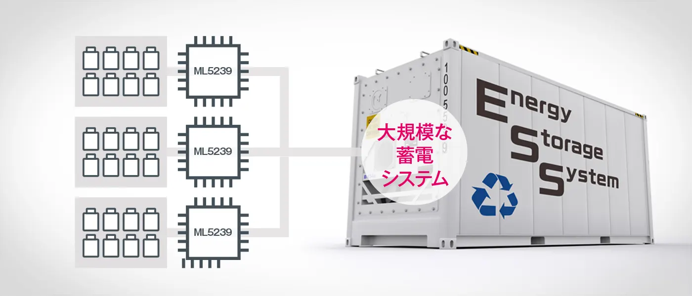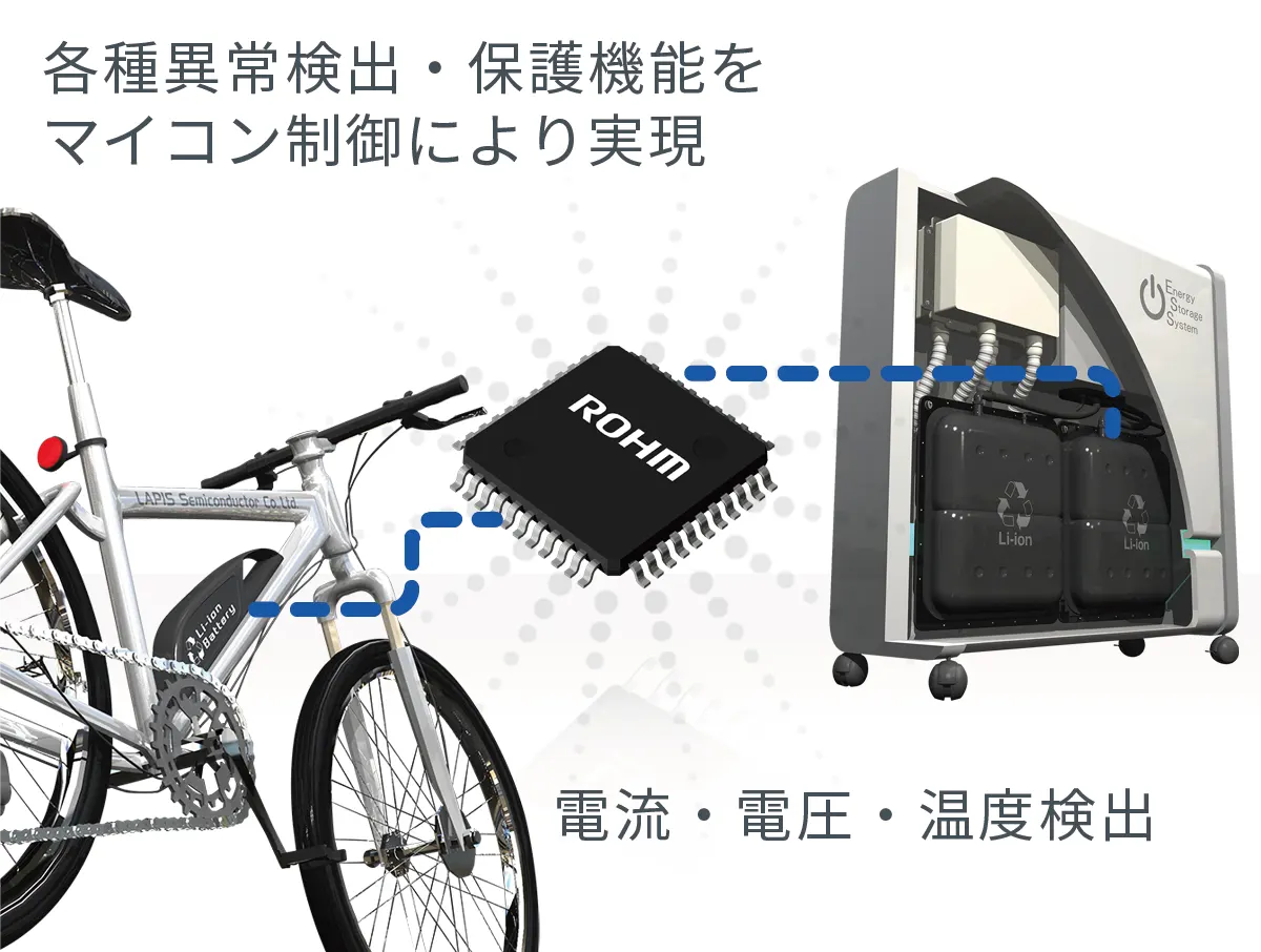 LAPIS TECHNOLOGY™を使ったリチウムイオン電池監視LSI アナログフロントエンドタイプは、電圧・電流・温度を高精度で測定し、マイコンからの制御により電池パックを保護します。