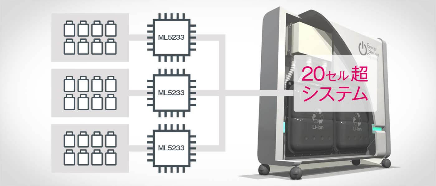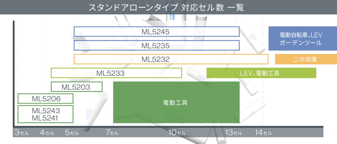 多セルシステム用の2次保護LSIとして14セル対応のML5232をライアップしています。