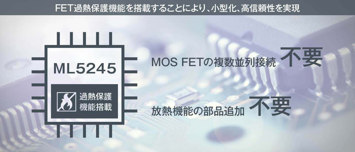 過熱対策のためにMOS FETを複数並列接続したり、放熱機能を追加する必要がなくなり、小型化、高信頼性を実現できます。