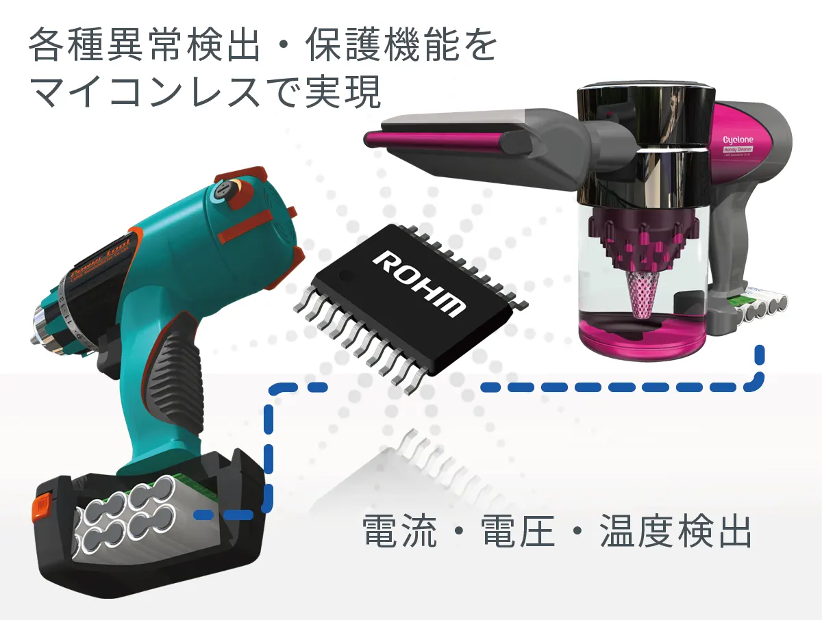 LAPIS TECHNOLOGY™を活用したリチウムイオン電池監視LSI スタンドアローンタイプは、マイコンによる制御を必要とせずにLSI単独で電池パックを保護します。