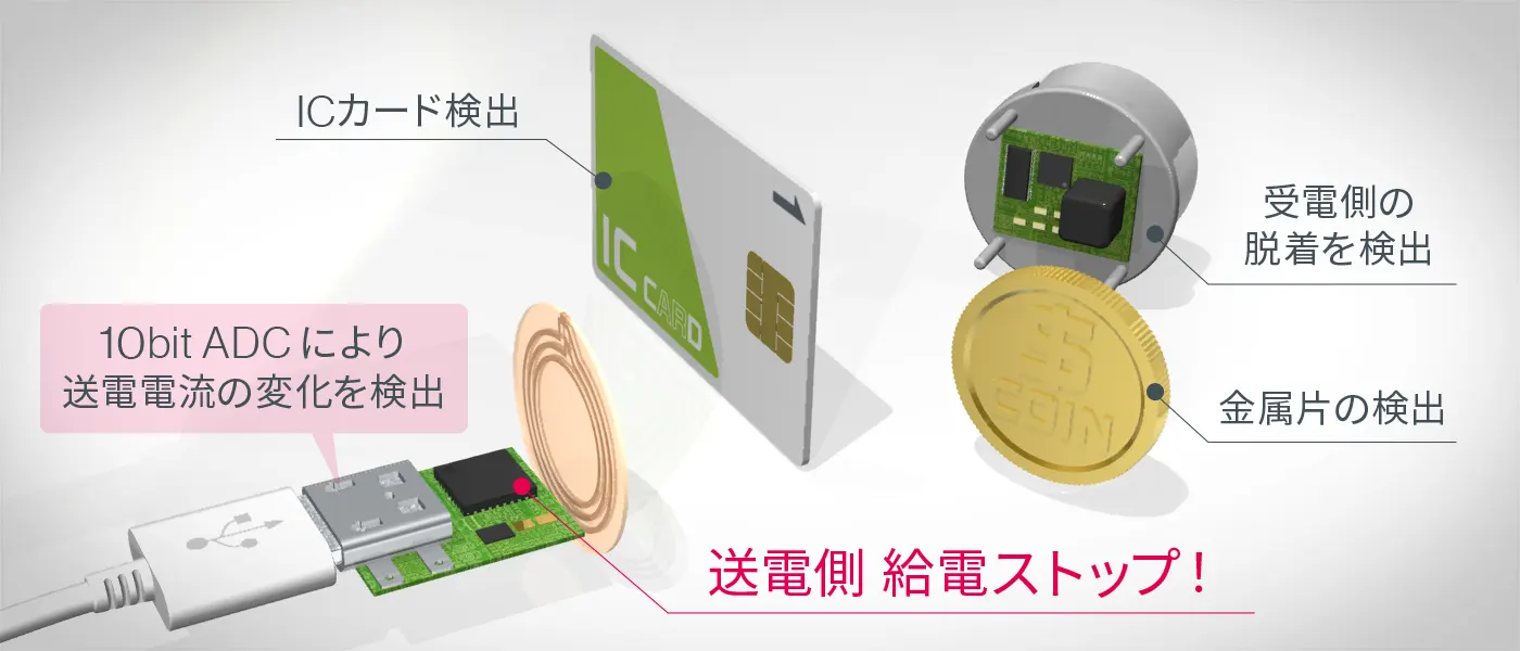 一方受電LSIは内蔵ADCにより整流後の電圧と内蔵シャントレギュレータに流れる不要電流から給電量の過不足を判断し、その情報を送電LSIへ通知することで送電LSIは不要な送電電力を排除し、送電量を最適化することができます。