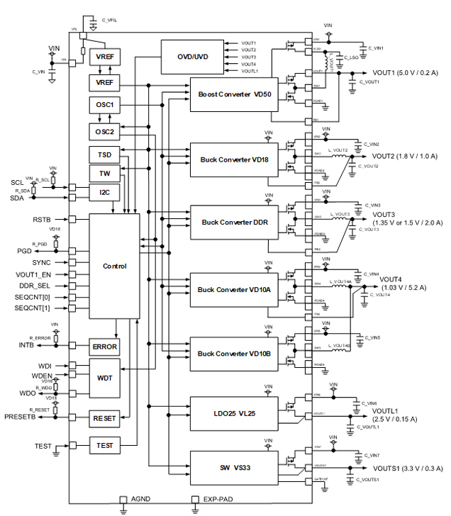- Power management for R-car V3M (*E3 if Iout ≦ 5.2A)- 最適シーケンス対応- DDR3/3Lメモリサポート
