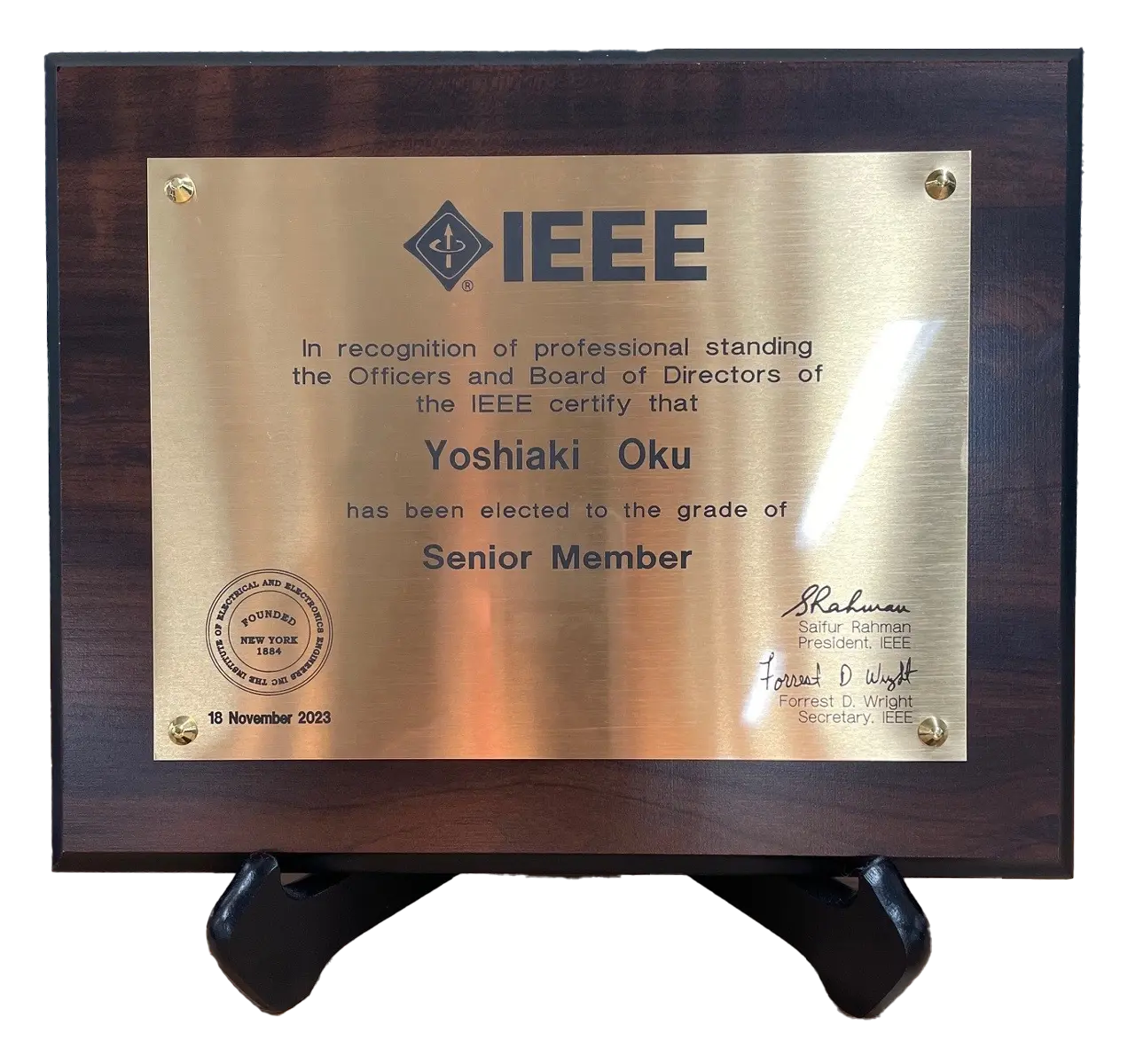 LSIプロセス分野や有機エレクトロニクス分野、センサ・IoT分野をはじめとする様々な領域において、経済産業省や文部科学省の国プロも含めて従事してきた研究開発の功績が認められ、ノミネータの関西学院大学の葛原正明教授(フェローメンバー)と広島大学の吉川公麿教授(フェローメンバー)、およびロームの中原センター長(シニアメンバー)から推薦により、シニアメンバーへの昇格が決定しました。また、現在、2023年よりIEEE関西支部の電子デバイス分科会で学会活動支援等のボランティアも行い、本支部主催の学会を開催する上で重要な役割を果たしてきています。