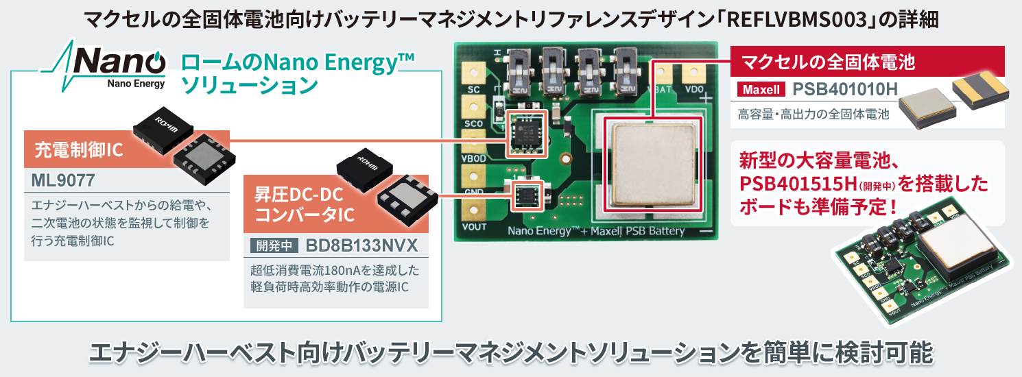 「REFLVBMS003」は、ロームグループであるラピステクノロジーの充電制御IC、ロームの超低消費電流技術「Nano Energy™」を搭載した電源ICを、マクセルの全固体電池(PSB401010H/PSB401515H(開発中))と組み合わせたリファレンスデザインです。電池と電源部分のソリューションとなっており、幅広いエナジーハーベストとの組み合わせが検討可能です。
