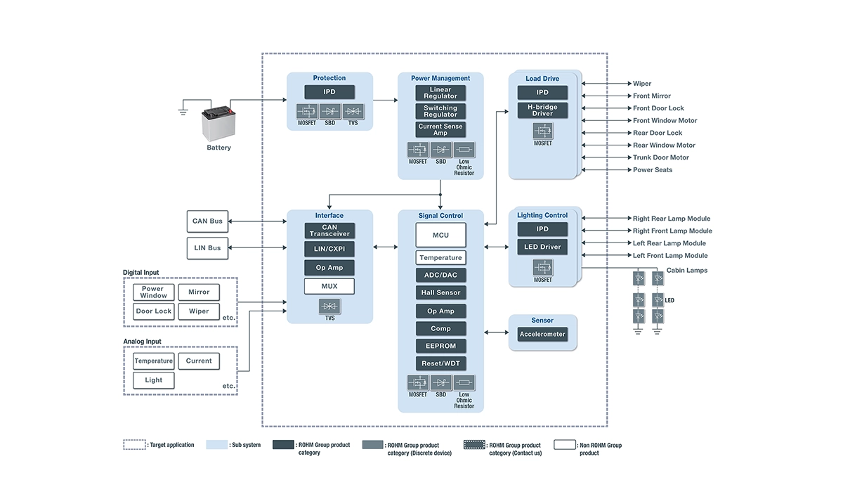 ロームは、ハーネスや車両の軽量化に貢献できるLIN/CANなどの多重通信ICや、低消費のDC-DCコンバータIC、機能安全性能を向上可能なIPDで、BCMの進化に貢献します。
