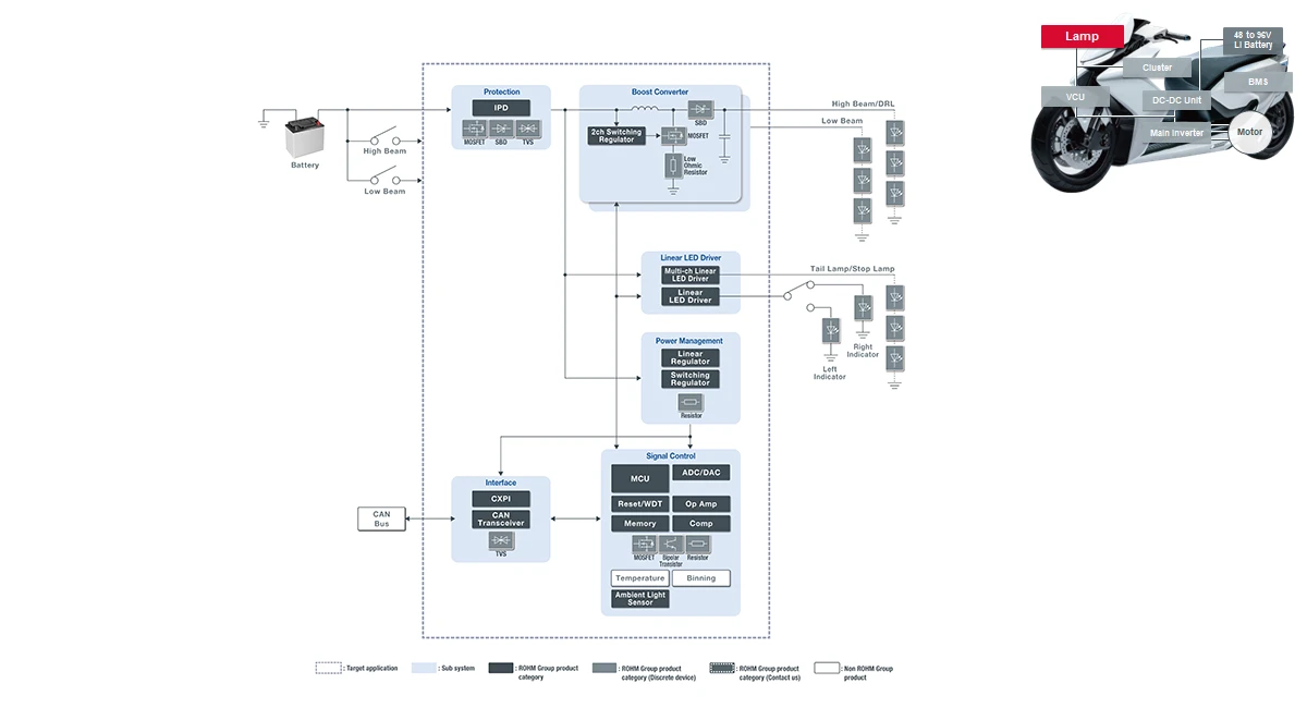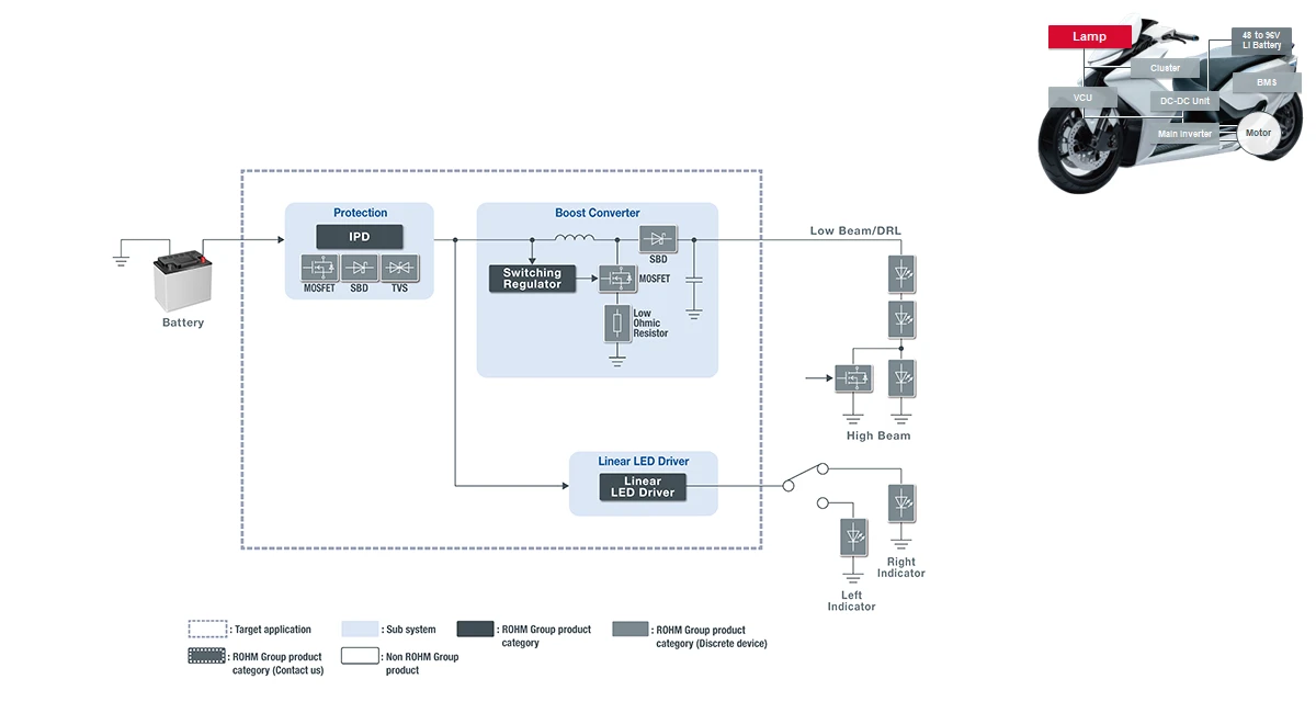 二輪バイクでは、単なる点灯にとどまらず、各国の規制に対応した光量や照射範囲の制御、さらにはヘッドライトと他のランプとの連携制御が求められることがあります。