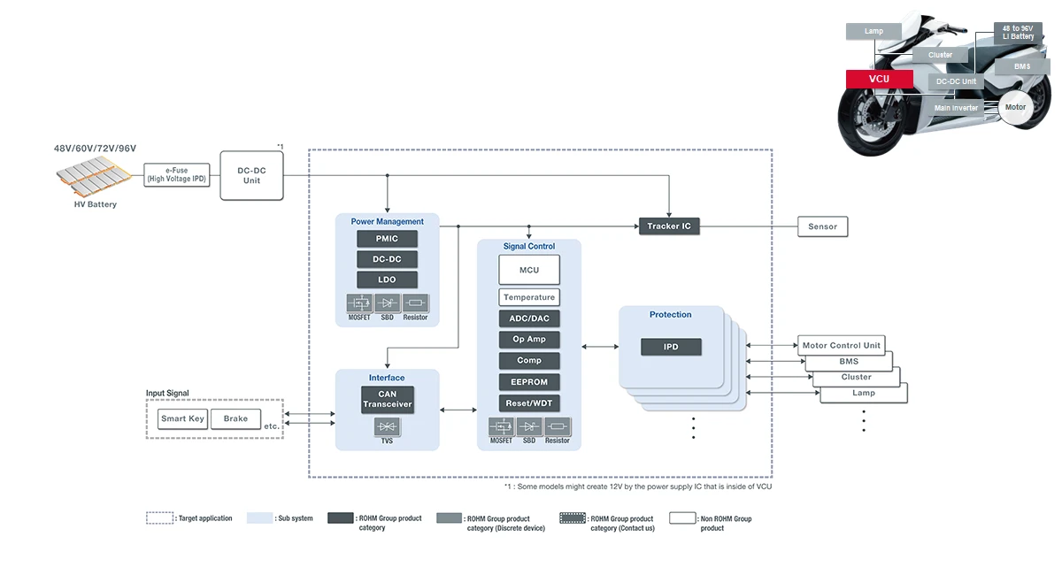 ロームは、各ユニットからの入力保護に不可欠なIPD(Intelligent Power Device)をはじめとする、VCUに必要な各種製品を提供しており、高寿命かつ高信頼性な制御の実現に貢献しています。