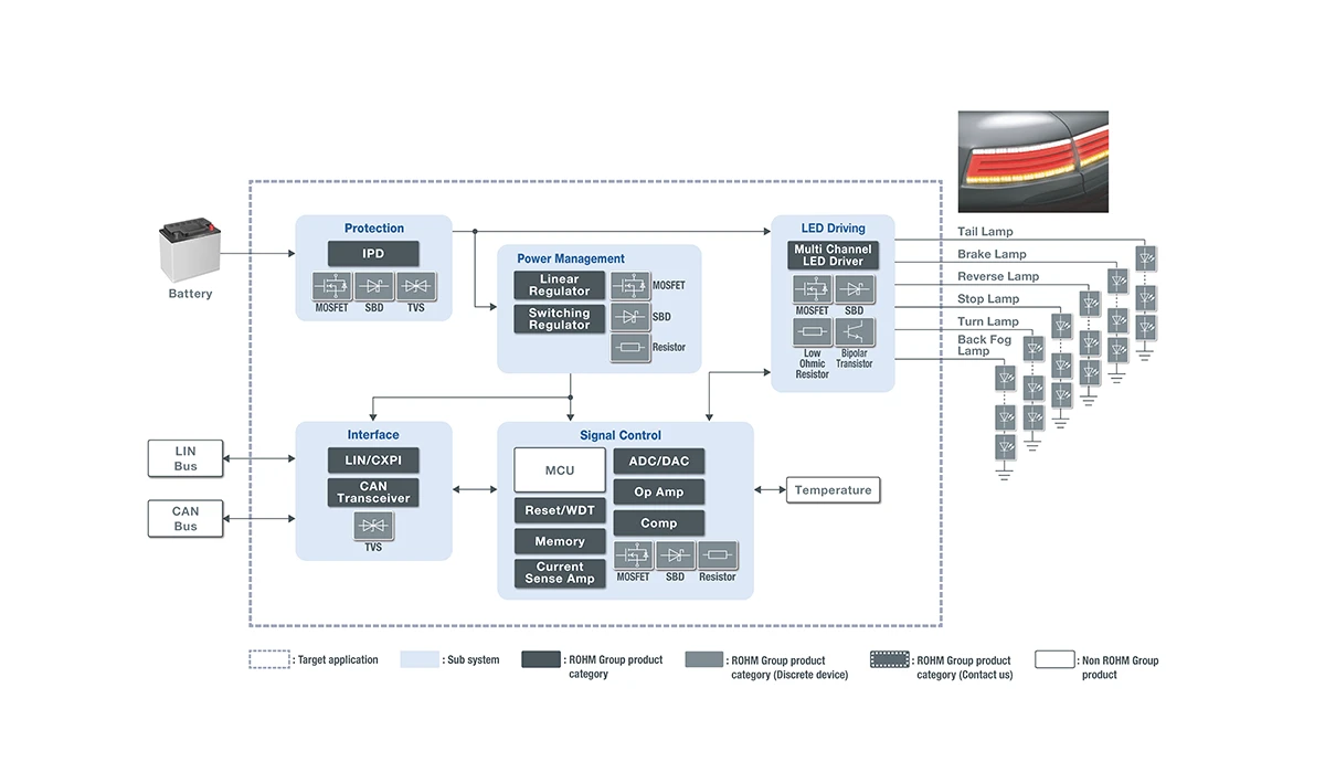 ロームは、機能安全に適合した高機能なLEDドライバICを提供し、リアランプの信頼性向上に貢献しています。