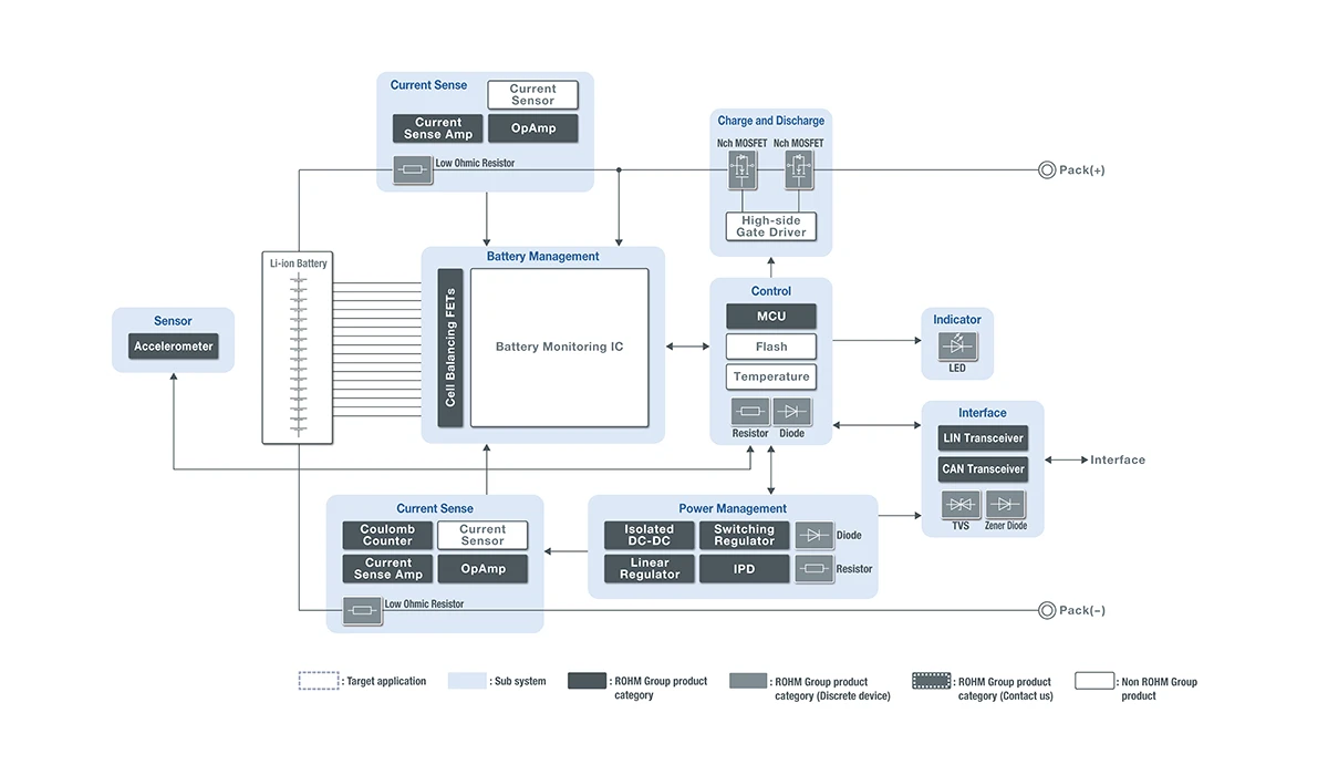 ロームは、MCU、電源IC、セルバランシング用FET、高精度な電流検出ソリューションを提供し、BMSの性能向上に貢献しています。
