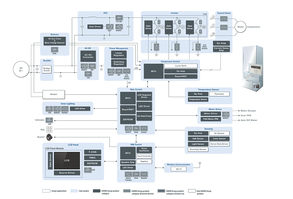 冷蔵庫では、省エネ化に向けて、搭載部品の高効率・低損失化や小型化に貢献するパワー製品の需要が増えています。